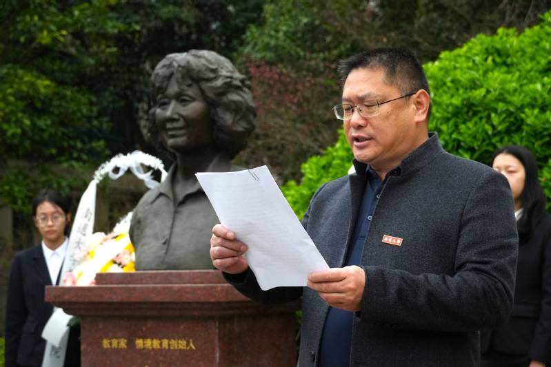 情境润心,师魂永续。活动伊始,全体肃立默哀,追思先生事迹。随后,师生代表敬献花篮,学院党委书记曹阳整理花篮缎带,全体师生怀着崇敬的心情向李吉林先生塑像三鞠躬,敬献鲜花。